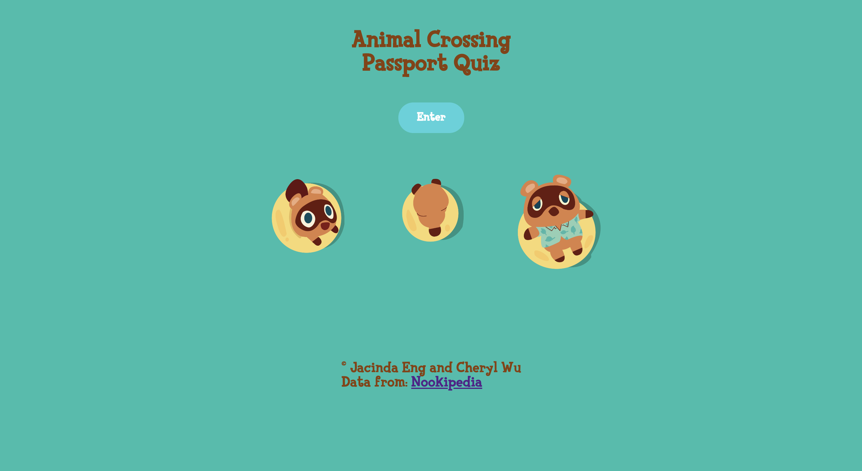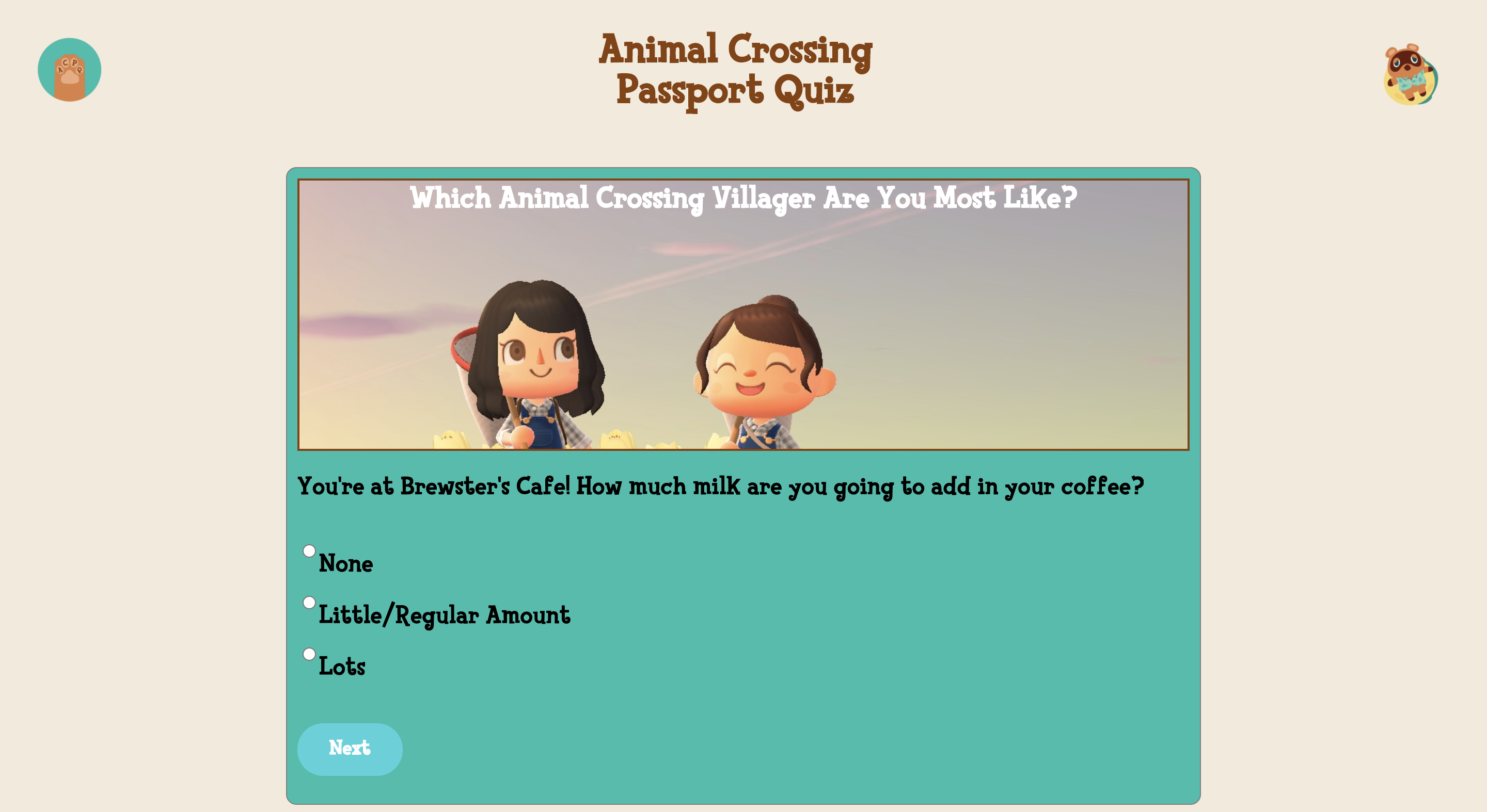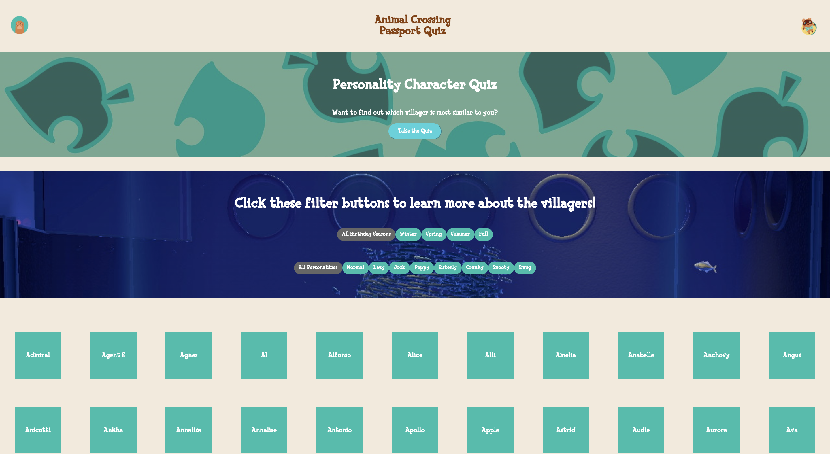 With the launch of the Animal Crossing New Horizons game, my team and I in our client-side development course designed and developed an Animal Crossing Passport Quiz website for users to find out which villager matches their personality, learn about the different villagers in the game, and experience a breeding flowers simulation. This website took six weeks to create with HTML/CSS, Javascript, React, Bootstrap, Firebase, and GitHub.