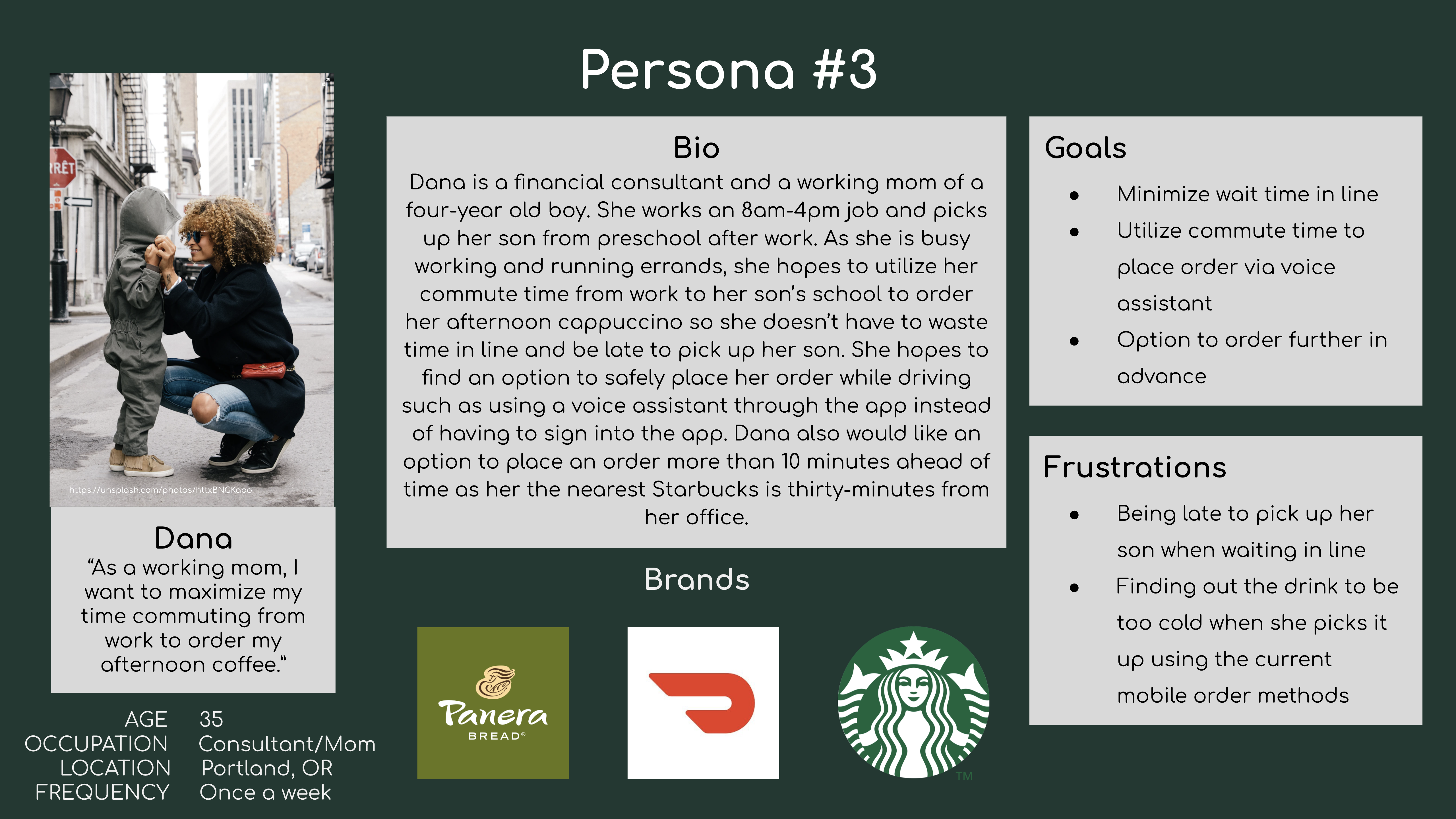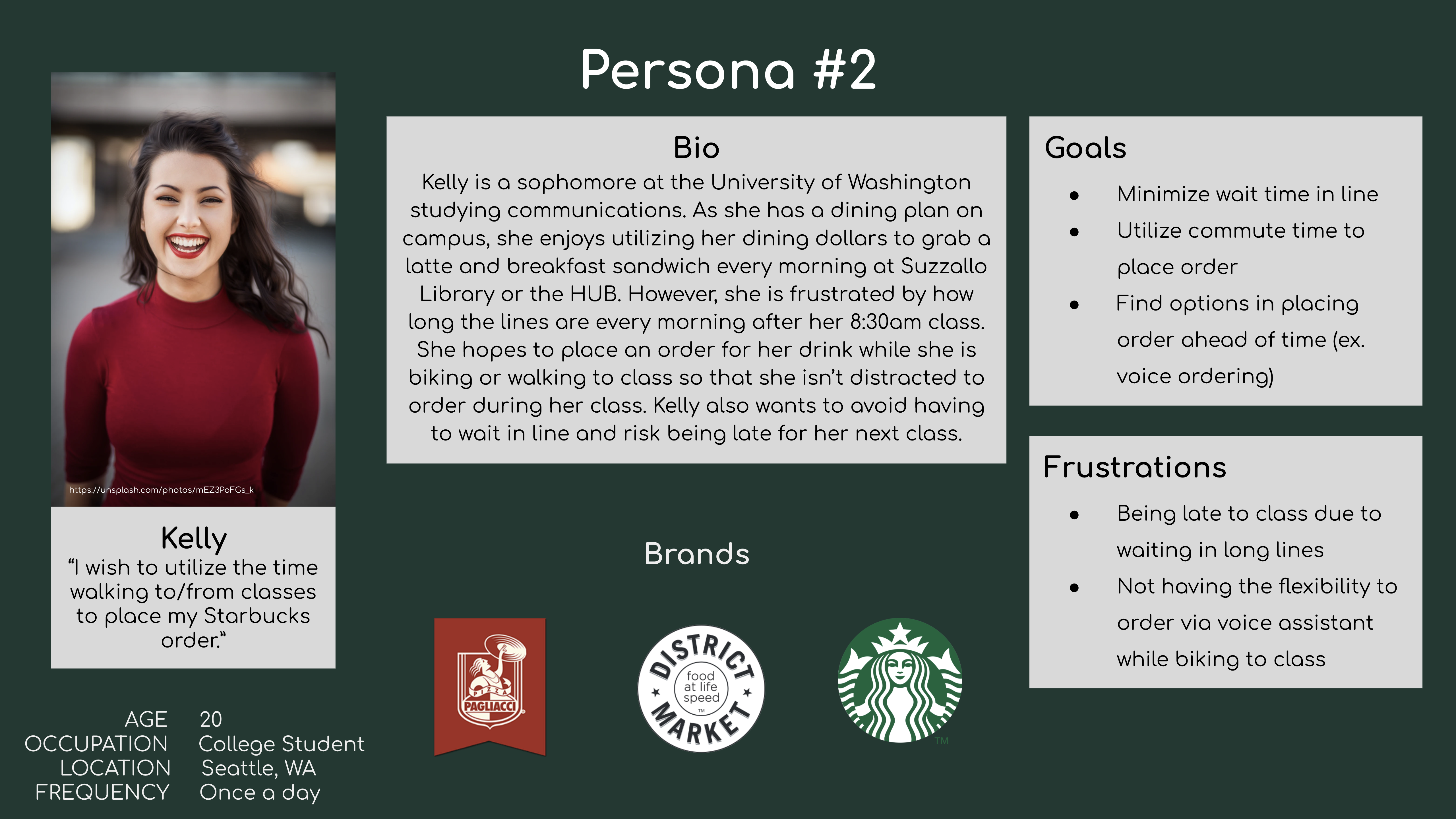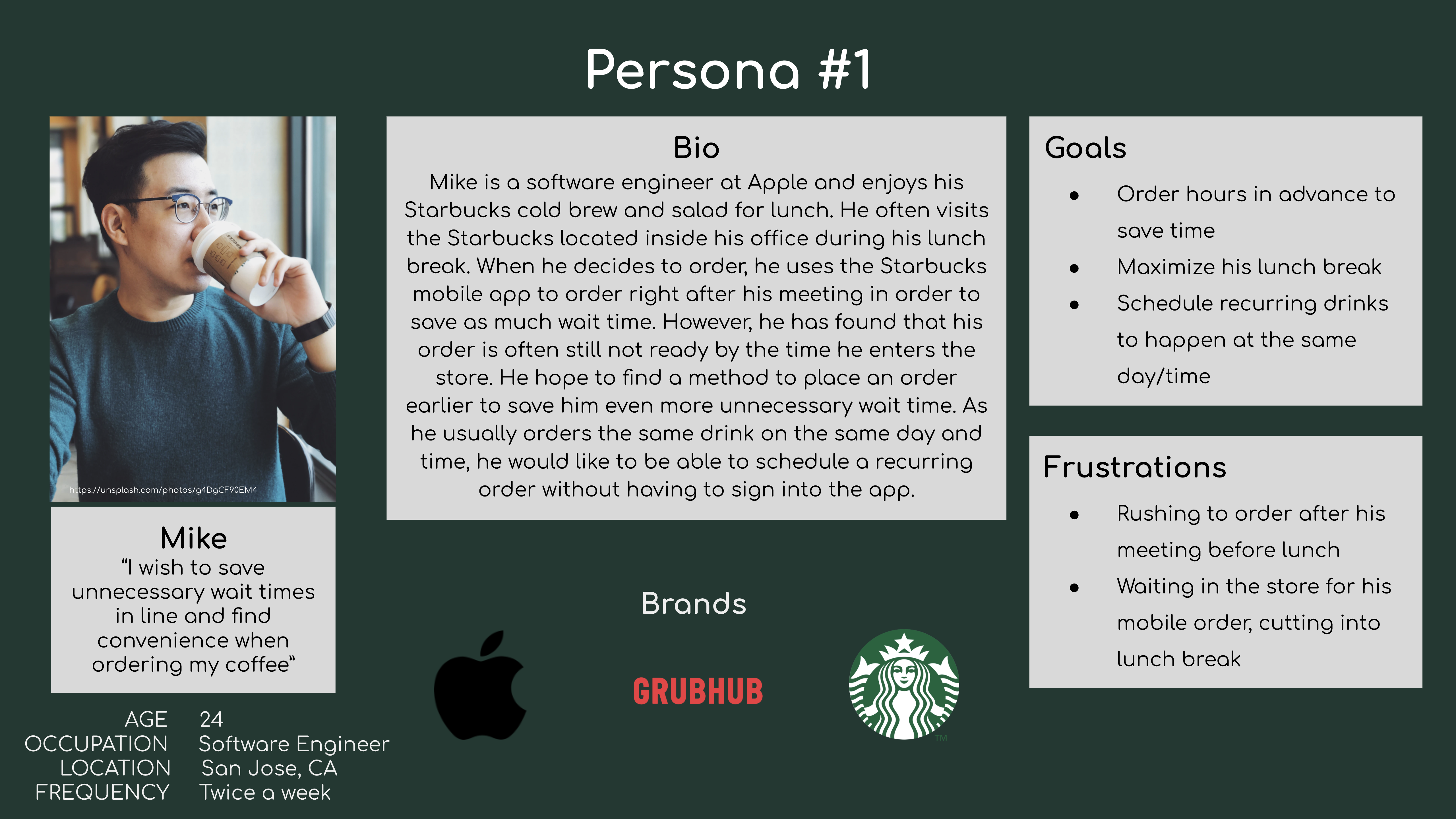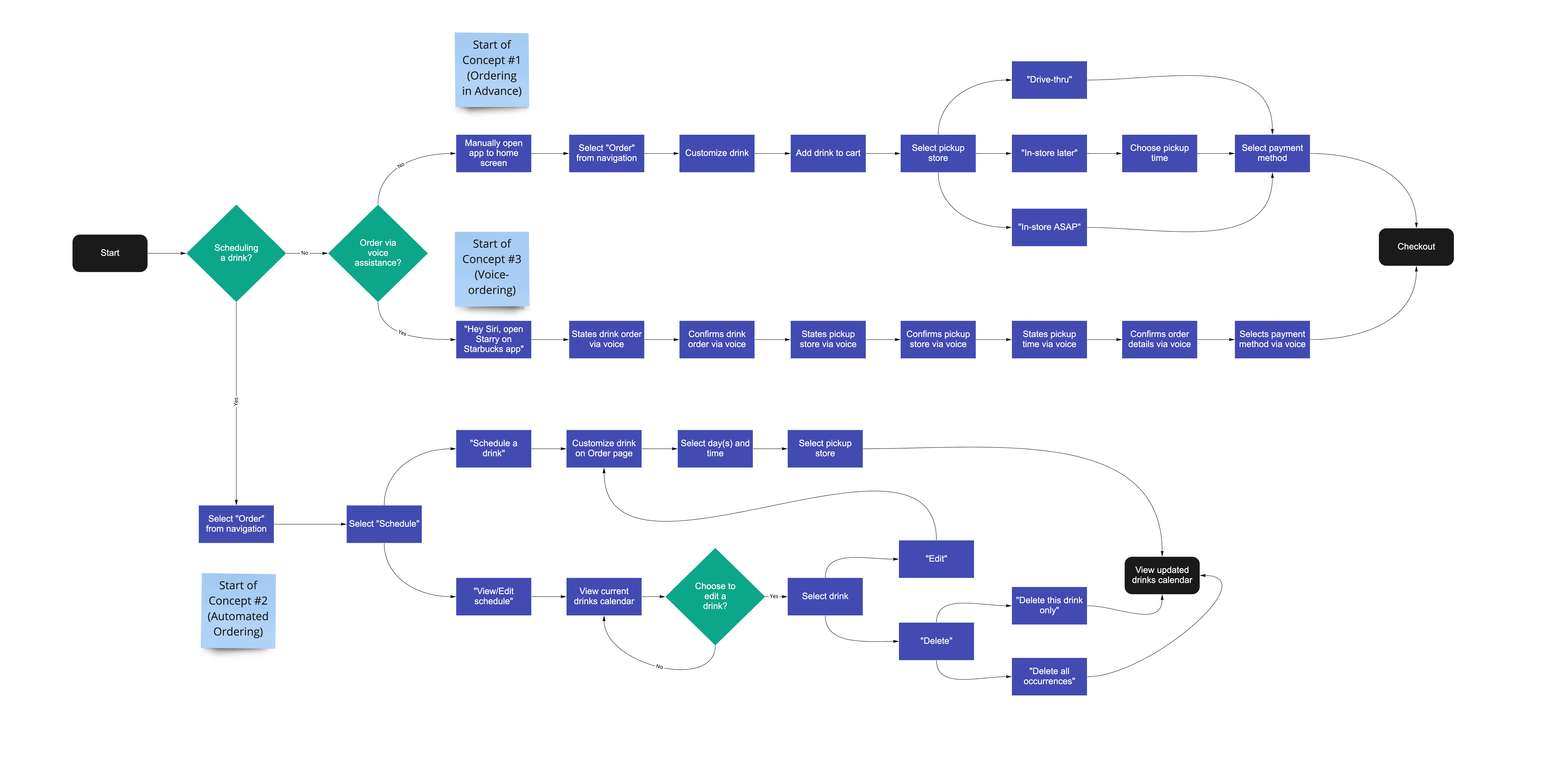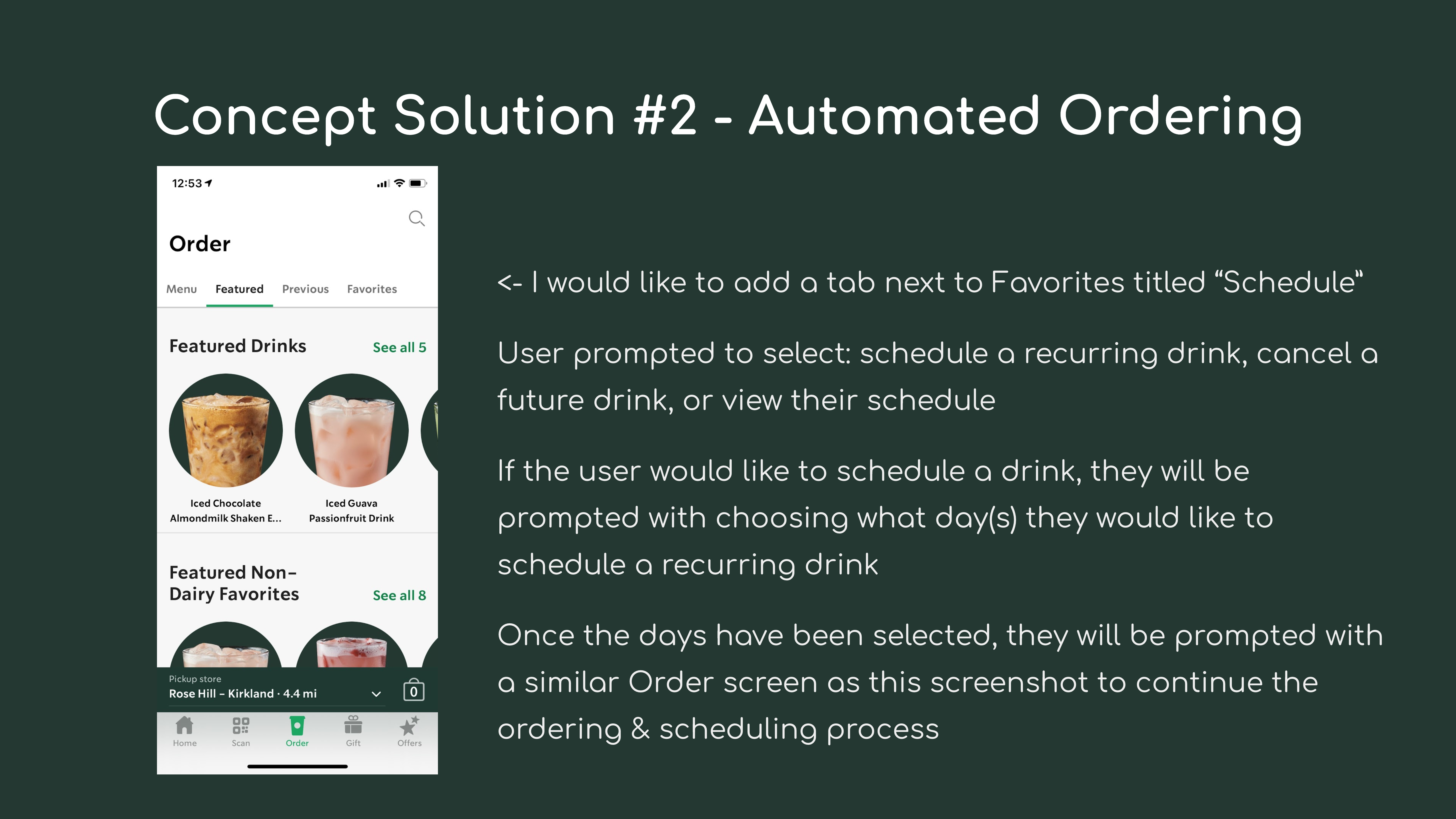 After selecting two concepts, I decided to focus my scope on building around convenience through ordering in advance and automated ordering for the 18-35 age group, in hopes of mobile orders increasing by 50%.