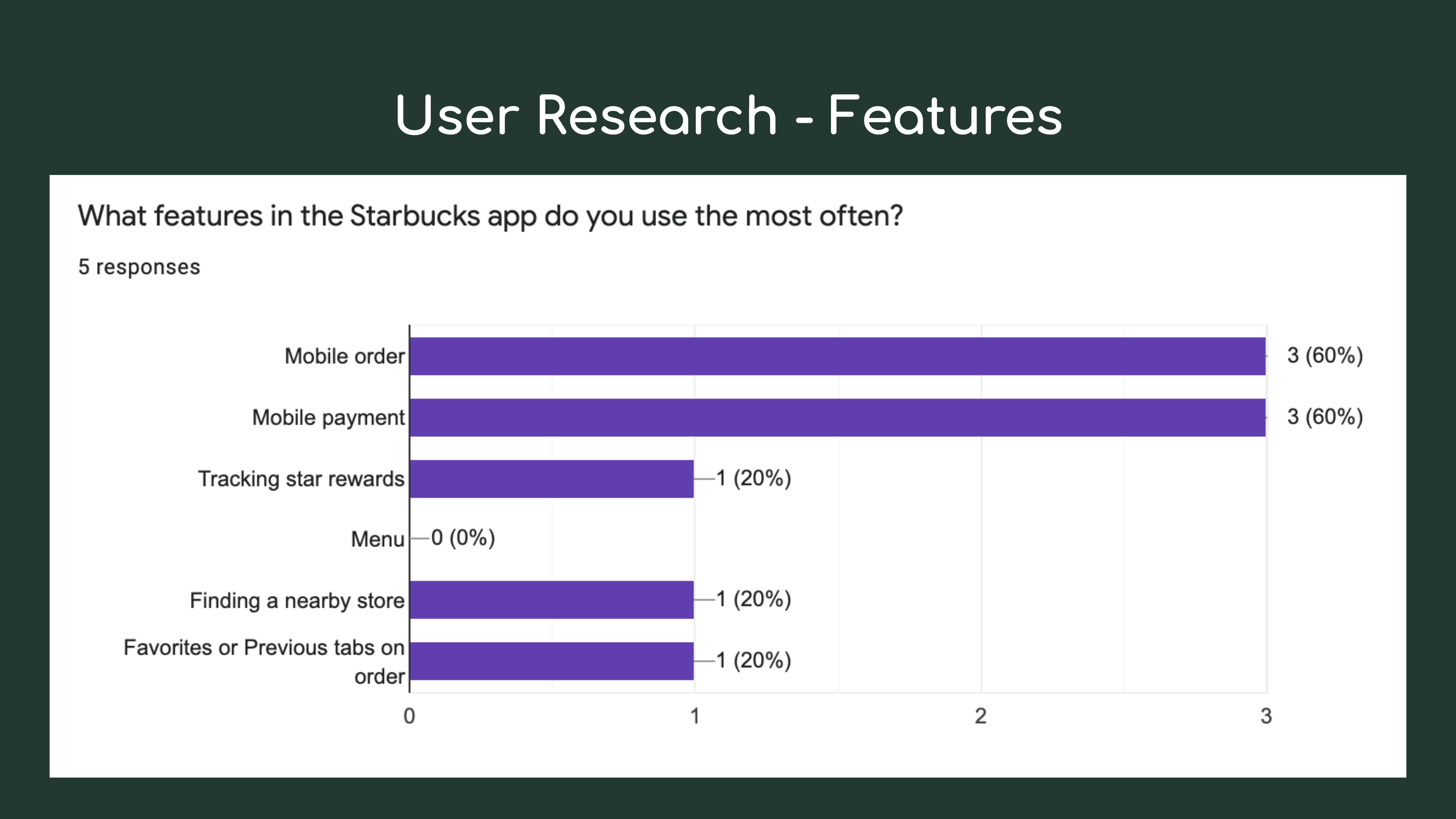 I interviewed/surveyed five individuals with ranging experience using the Starbucks mobile app by asking open-ended questions regarding their experience and asked for feedback on my proposed concepts.