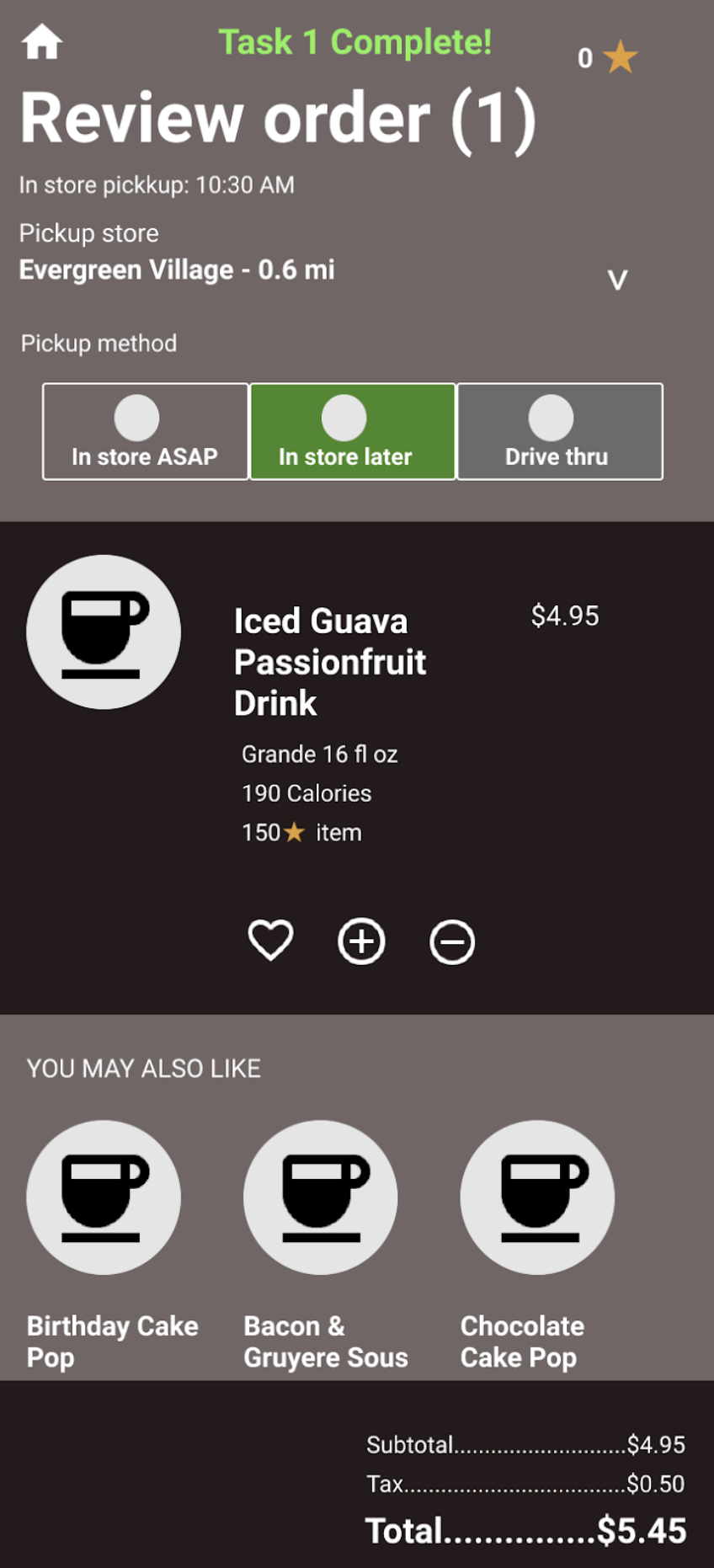 For the first task of ordering a drink ahead of time, most noted the experience as "simple and straightforward" and "pretty easy for the first time users" which was excellent feedback to hear. However, some did not that words were not eye-catching enough and some spots required more focus which was later improved in further iterations.