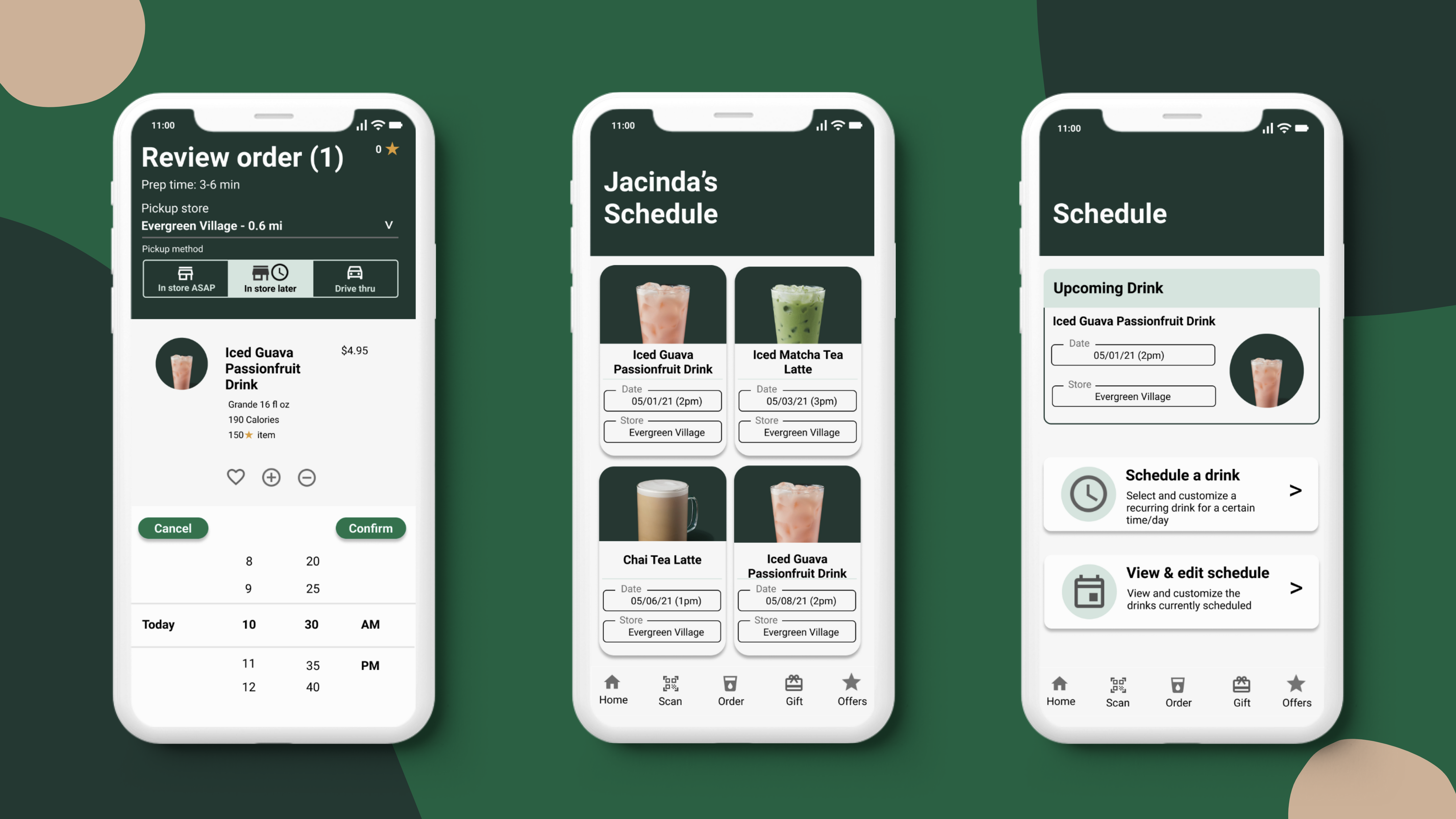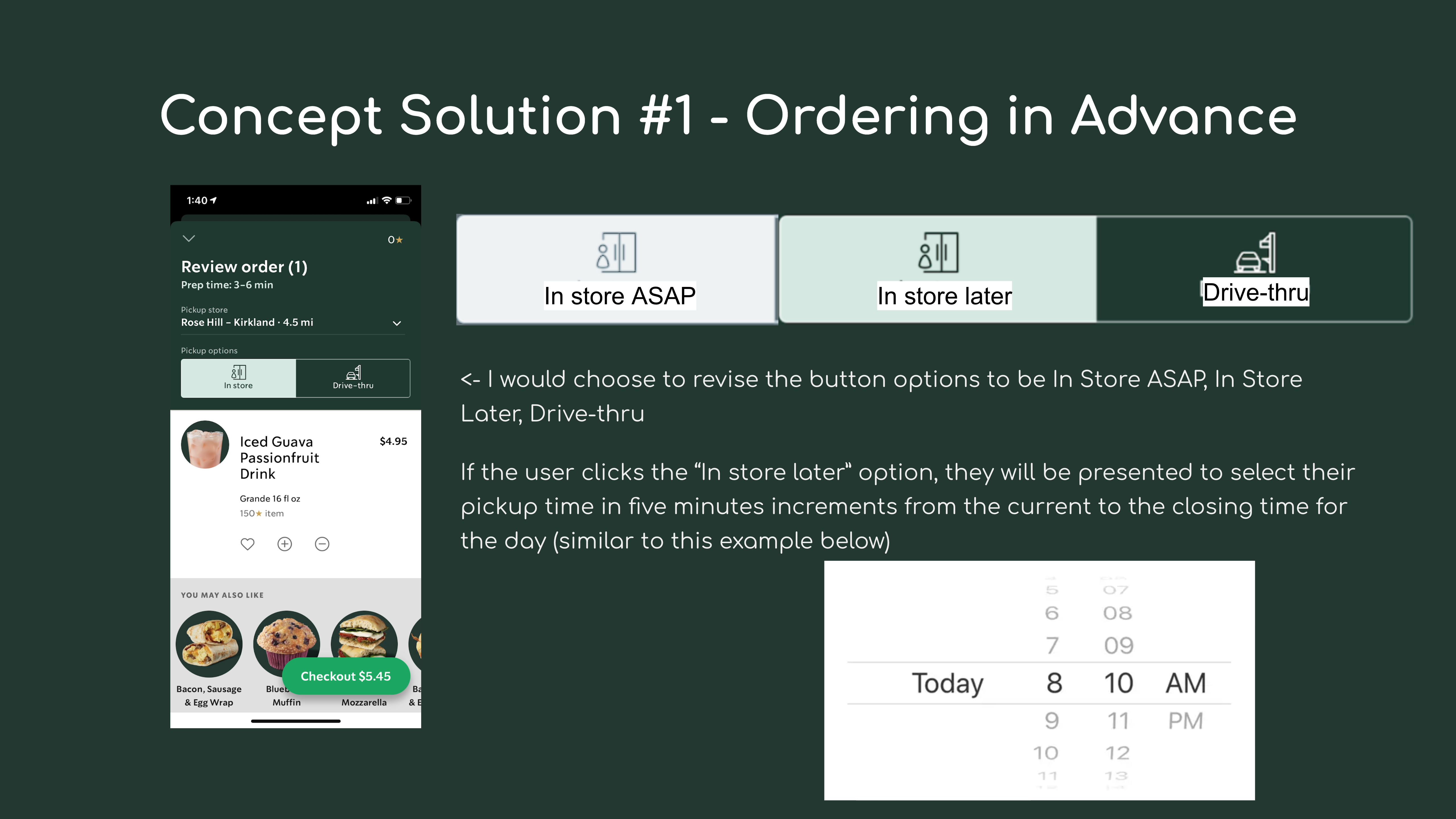 On the left, I added an “in-store later” option to the existing review order page for users to pick up a drink at a later time that day. Once the option is selected, the user can scroll through the time selection widget at the bottom of the screen.