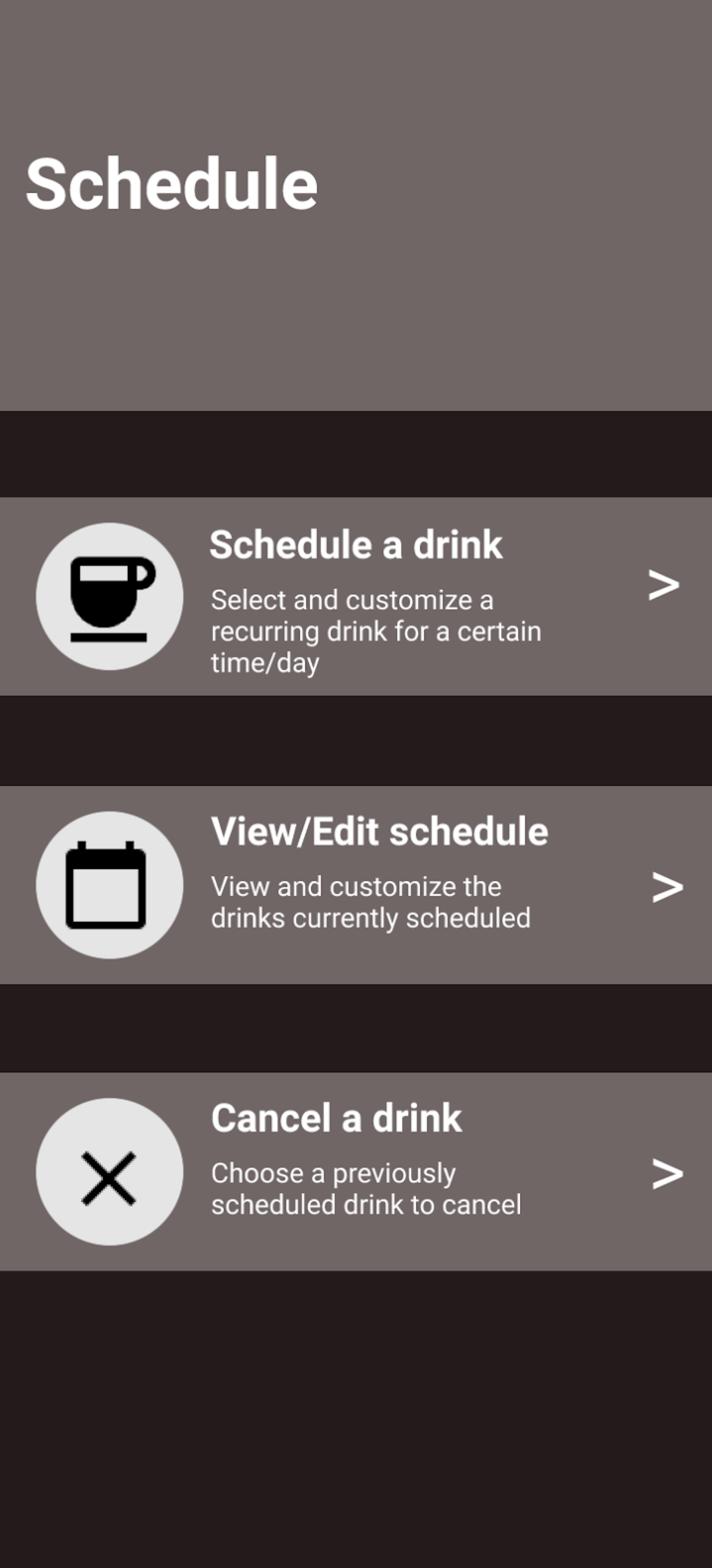 On the right, are the options presented for the user to schedule a future recurring drink or view/edit their current schedule. The screen also shows the user’s upcoming scheduled drink.