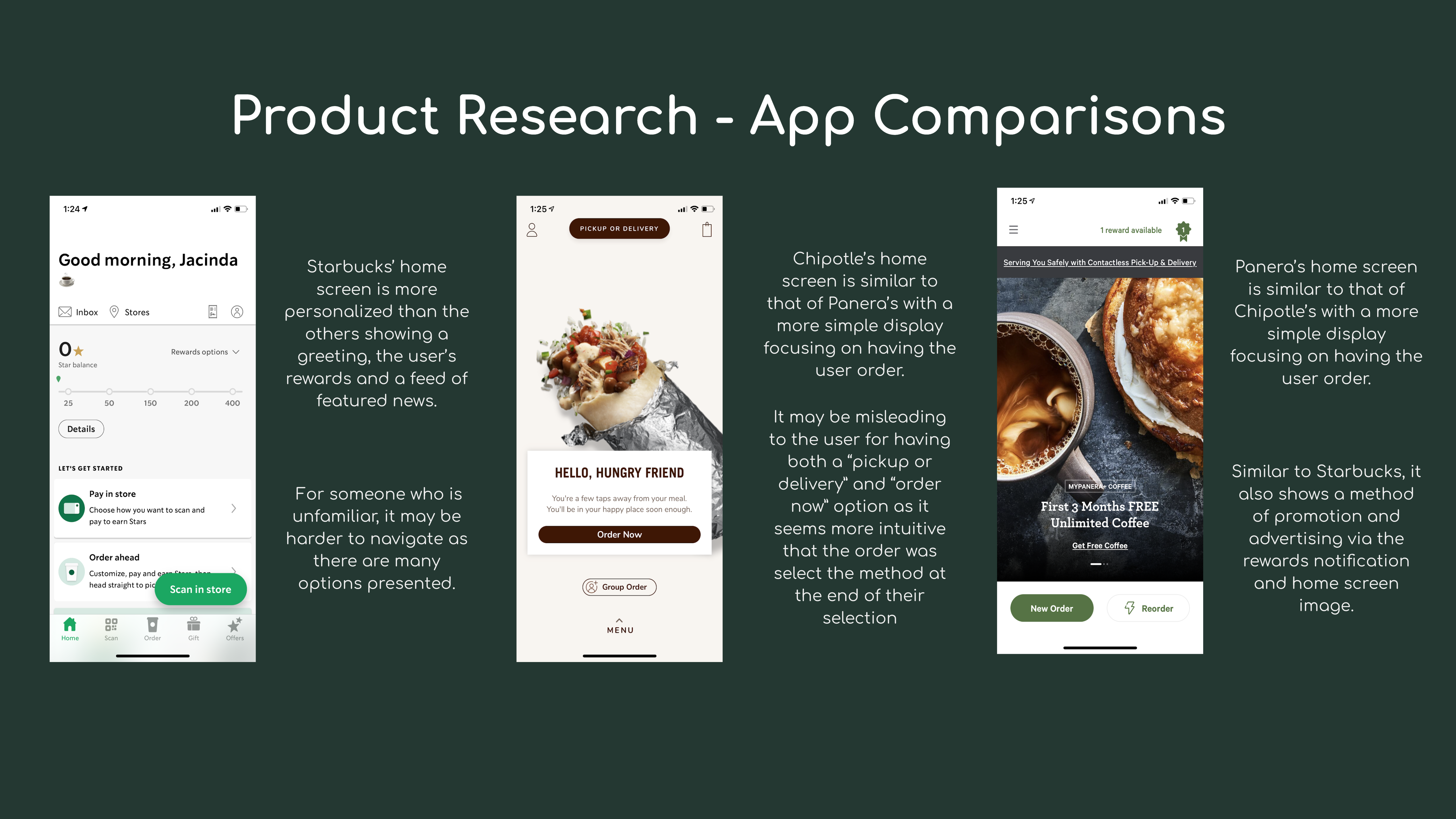 I compared three of my most common food ordering apps (from left to right): Starbucks, Chipotle, and Panera. Here are the notes from comparing the three home screens.